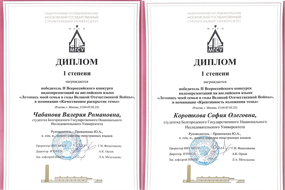 Организатором выступил Институт экономики, управления и коммуникаций в сфере строительства и недвижимости Московского государственного строительного университета. Студентки факультета иностранных языков педагогического института НИУ «БелГУ» Валерия Чабанова и София Короткова стали обладателями дипломов I степени. Валерия победила в номинации «Качественное раскрытие темы», а София – в номинации «Креативность изложения темы».