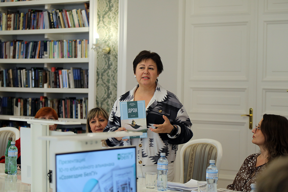 За круглым столом обсуждались темы поддержки литературно одарённой молодёжи, роль альманаха в становлении творческой личности, в развитии связей между разными поколениями авторов. Соавтор сборника выпускница филологического факультета вуза, председатель БРОО литературного творчества «Мир писателя», редактор журнала «Дрон» Людмила Брагина поздравила присутствующих с юбилеем альманаха, отметив, что в этом издании все звёзды живые, яркие, не погасшие, они светят не отражённым светом, на наших глазах творя историю. Она передала первый выпуск литературного журнала «Дрон» проректору по воспитательной работе и молодёжной политике НИУ «БелГУ» Елене Малышкиной.