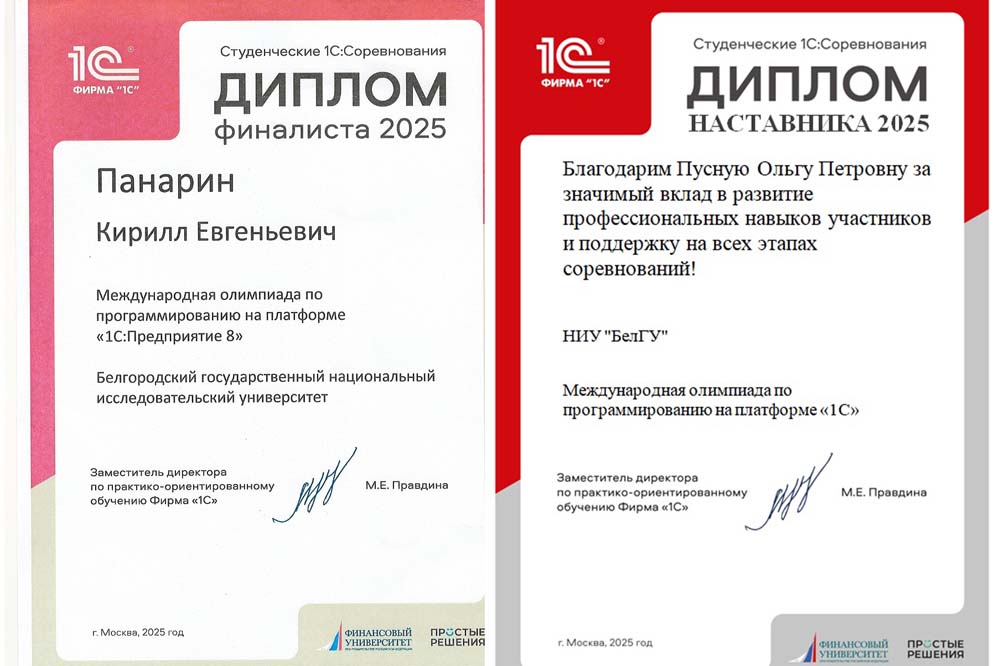 Олимпиада по программированию на «1С» проводится с 1995 года. Белгородский госуниверситет представил студент института инженерных и цифровых технологий Кирилл Панарин. Для участия в финале конкурса были приглашены 70 студентов, показавших наилучшие результаты. Конкуренция за выход в финал была 42 человека на место. Студент НИУ «БелГУ», показав высокие результаты в первом туре среди более чем двух с половиной тысяч студентов, вошёл в число 70 лучших.