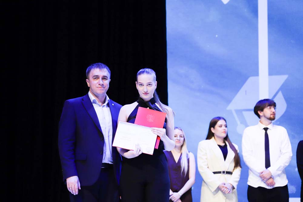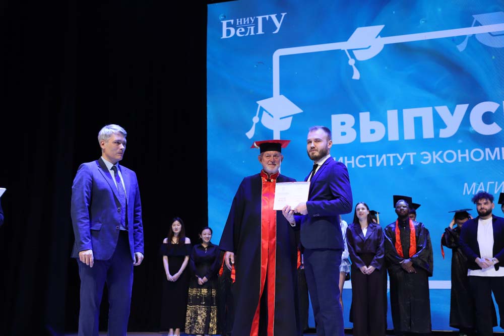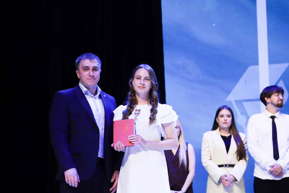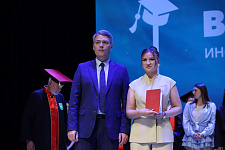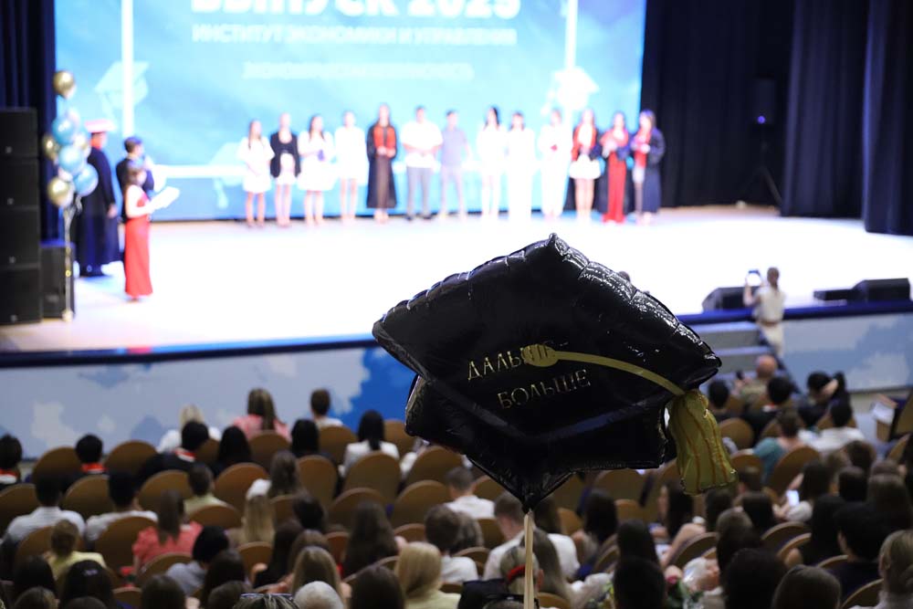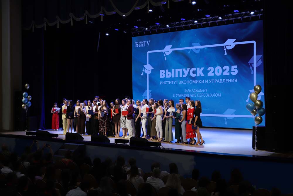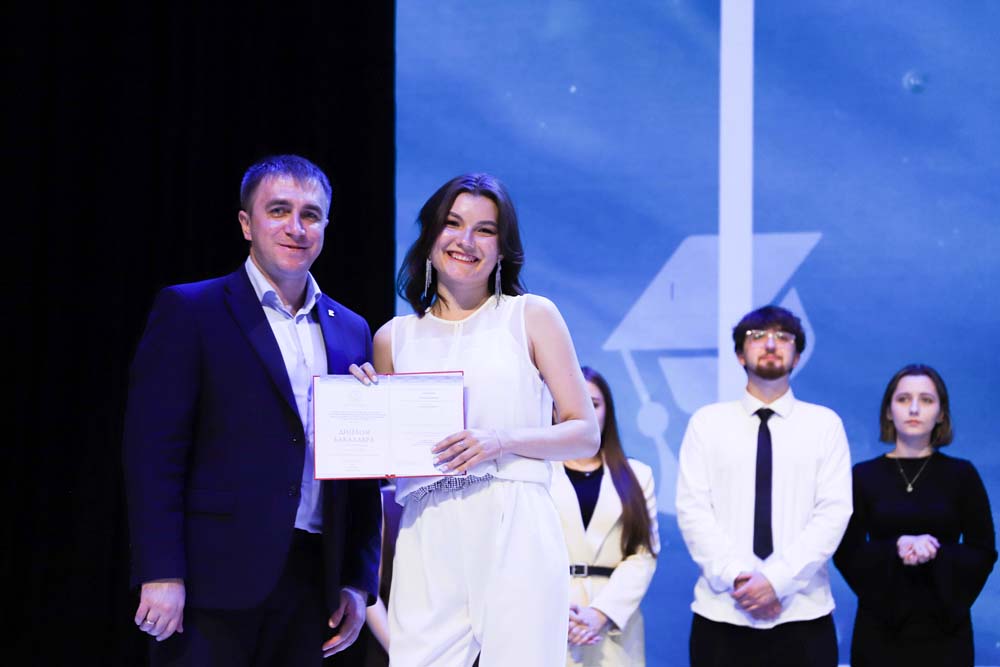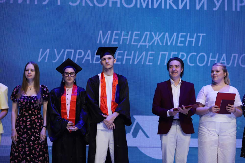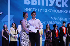 В институте экономики и управления прошла торжественная церемония вручения дипломов о высшем профессиональном образовании. В начале праздничного вечера проректор по административной работе Владимир Геращенко и директор ИЭиУ Виктор Захаров поздравили со свадьбой выпускника Данила Толстенко и студентку педагогического института Елизавету Малафееву. Владимир Михайлович отметил, что молодожёны сочетались браком 8 июля – в День семьи, любви и верности, посвящённый памяти Петра и Февронии муромских.