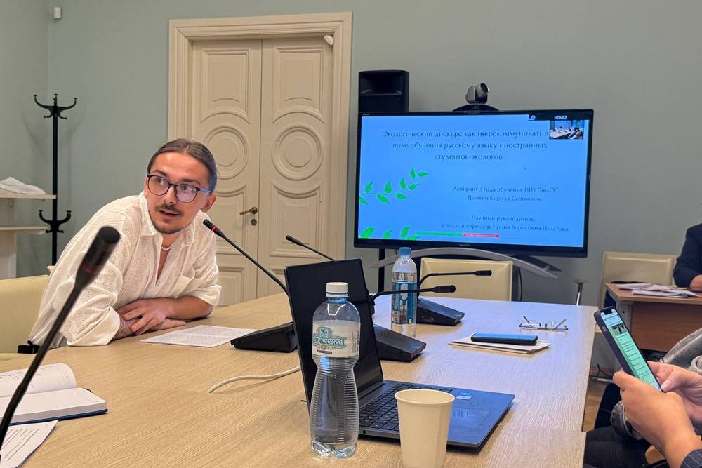 Кирилл Сергеевич представил научному сообществу результаты своей диссертационной работы в докладе на тему: «Экологический дискурс как инфокоммуникативное поле обучения профессиональному русскому языку иностранных студентов-экологов». В своём выступлении он затронул ключевые вопросы профессионально-коммуникативного обучения, переосмысление традиционного понимания дискурса, в том числе экологического, а также предложил инновационные методические решения по интеграции экодискурса в учебный процесс для иностранных учащихся с разным уровнем знания русского языка.