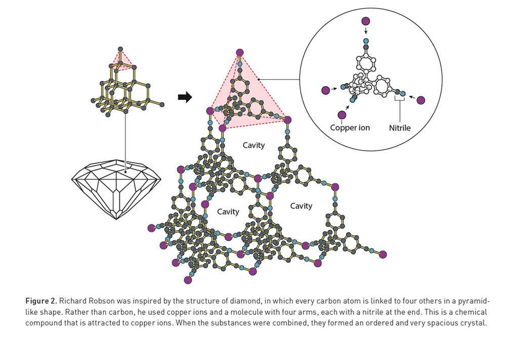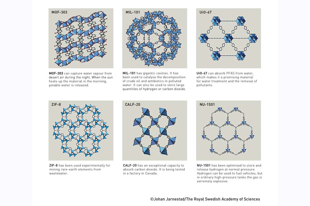 В пресс-релизе Королевской Шведской академии наук говорится, что лауреаты Нобелевской премии по химии 2025 года «разработали новую форму молекулярной архитектуры». Эти учёные создали молекулярные конструкции с большими пространствами, через которые могут проходить газы и другие химические вещества. В их конструкциях ионы металлов играют роль «краеугольных камней», связанных длинными органическими (углеродными) молекулами. Вместе ионы металлов и молекулы организованы в кристаллы с большими полостями. Эти конструкции – металлоорганические каркасы – могут использоваться для сбора воды из воздуха в пустыне, улавливания углекислого газа, хранения токсичных газов или катализа химических реакций.