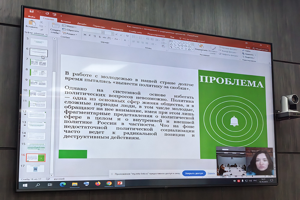 Завершающим этапом стало активное обсуждение поднятых вопросов экспертами, специалистами молодёжной политики вузов региона. Участники высказали своё мнение относительно эффективности существующих методик воспитания молодёжи и путей повышения уровня информированности студентов о значении традиционных ценностей.