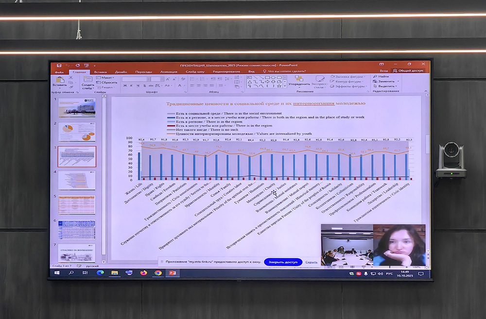 Инна Шаповалова выступила с темой: «Традиционные ценности в рефлексии региональной молодёжи: проблемы интериоризации и формирования», осветила проблему восприятия традиционных ценностей современной молодёжью и представила результаты масштабного социологического исследования, проведённого под её руководством. Эксперт также рассказала о выявленных в рамках исследования группах ценностно-ёмких мероприятий, которые в первую очередь могут быть рекомендованы для воспитательных и образовательных программ в образовательных учреждениях. К таким мероприятиям отнесены организация и проведение культурных мероприятий, помощь пожилым и престарелым людям, работа с детьми-сиротами и детьми из неблагополучных семей, общественное волонтёрство, помощь военным, лицам, принимающим участие в СВО, и их семьям, в госпиталях и больницах, беженцам.