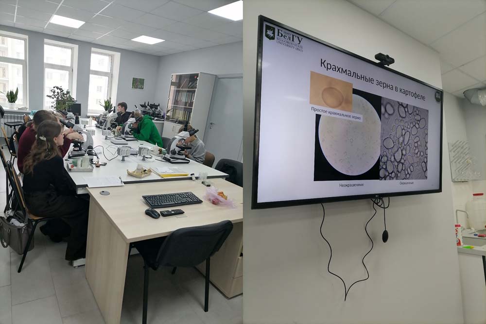 Мастер-класс по цитологии «Большой мир маленьких клеток» провели преподаватели кафедры биотехнологии и микробиологии Ольга Родченко и Маргарита Мамыкина. Студенты первого курса познакомились с устройством микроскопа, освоили навыки работы с ним. Также они научились изготавливать микропрепараты. Ребята рассмотрели различные формы растительных клеток на примере мякоти груши и томата, листа фикуса и кожицы лука, рассмотрели хромопласты и хлоропласты в клетках томата и листа фикуса соответственно. Ребята изучили некоторые эргастические вещества, рассмотрели крахмальные зёрна картофеля и кристаллы оксалата кальция в клетках шелухи лука.