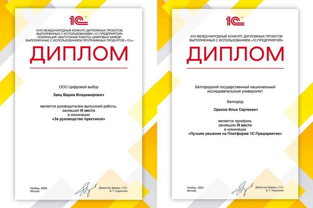 Выпускник института инженерных и цифровых технологий НИУ «БелГУ» Илья Орехов с проектом «Разработка информационной системы «Турагентство» занял 3 место в номинации «Лучшее решение на платформе 1С:Предприятие». Руководитель практики Ильи со стороны предприятия-партнёра Вадим Заяц награждён дипломом в номинации «Руководство практикой», а руководитель выпускной работы – преподаватель кафедры прикладной информатики и информационных технологий Ольга Пусная награждена дипломом в номинации «Лучшее решение на платформе 1С:Предприятие».