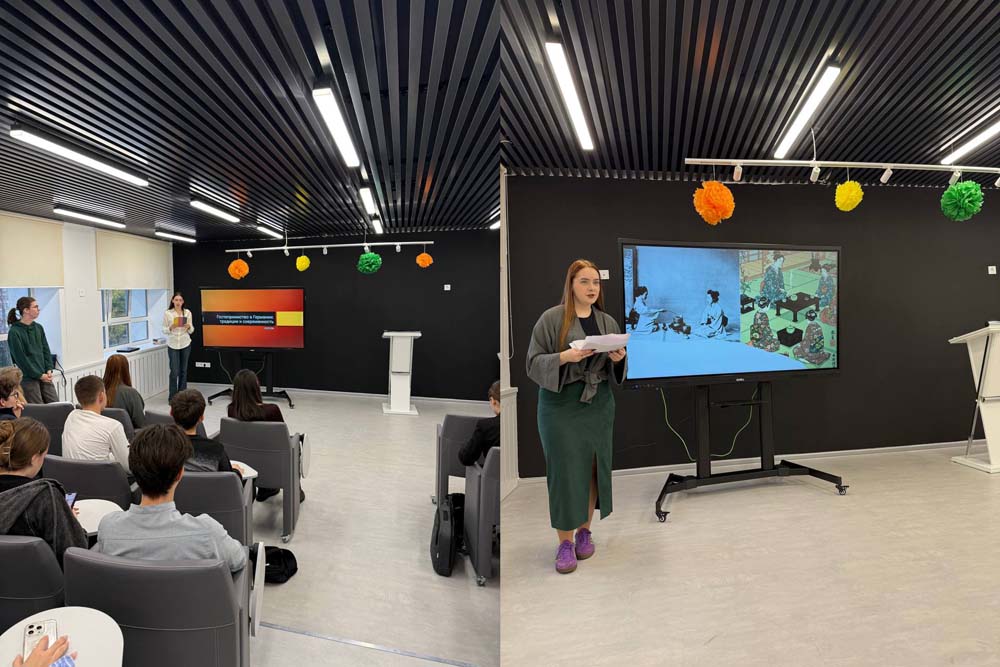 Студенты-практиканты выступили в роли гидов-экспертов по миру: Дарья Баранова представляла – Россию, Валентина Ерошенко – Японию, Андрей Козырев – Турцию, Елизавета Коренева – Италию, София Володина – США, Александра Яковлева – Германию.