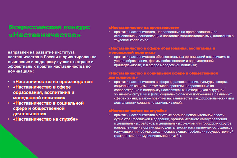 Организованный Министерством просвещения Всероссийский конкурс «Наставничество», который проводится в рамках Стратегии развития наставничества в России до 2030 года, объединил более 10 тысяч участников из 89 субъектов РФ. По итогам отбора на суд жюри было передано 4000 заявок, победителей определяли по номинациям «Наставничество на производстве», «Наставничество в сфере образования, воспитания и молодёжной политики», «Наставничество в социальной сфере и общественной деятельности» и «Наставничество на службе».