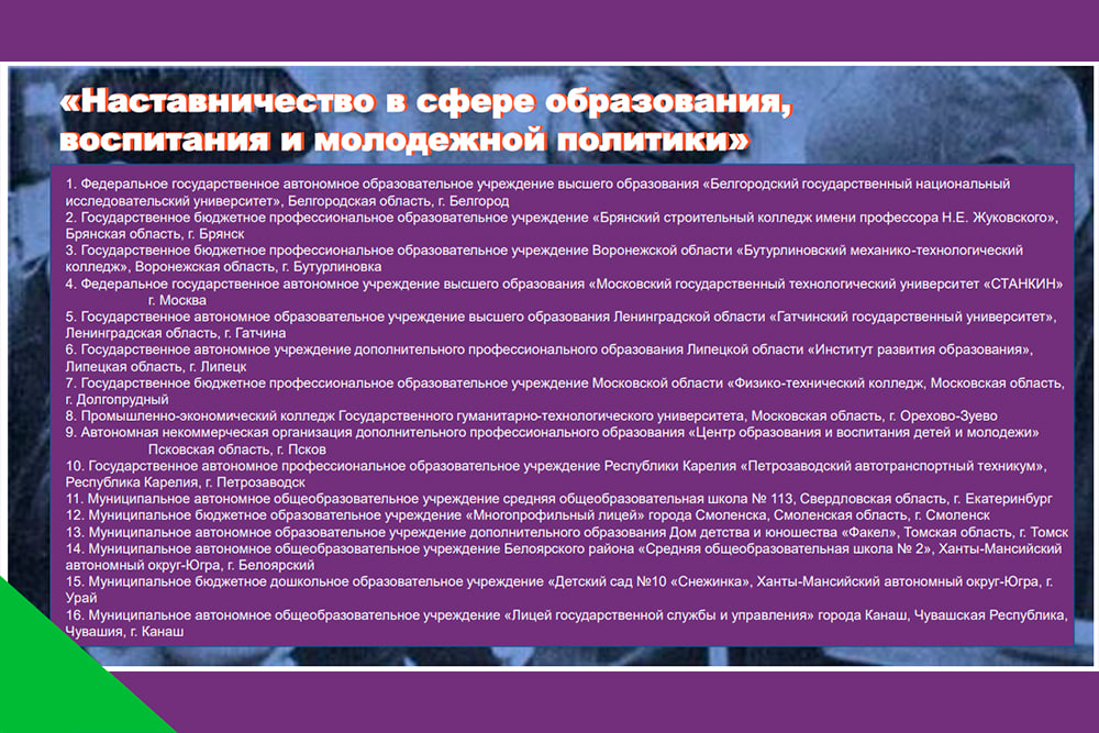 Для справки: Всероссийский конкурс «Наставничество» направлен на создание условий для развития института наставничества и ориентирован на выявление и поддержку, масштабирование и тиражирование лучших в стране практик наставничества. Партнёрами конкурса выступили Минобрнауки России, «Росмолодёжь», Ассоциация «Добро.рф», некоммерческие организации и институты общественного развития «Добро.рф», АНО «Центр знаний “Машук”», АНО «Россия – страна возможностей», РДДМ «Движение первых», Российское общество «Знание», МООО «РСО», «ОПОРА РОССИИ».