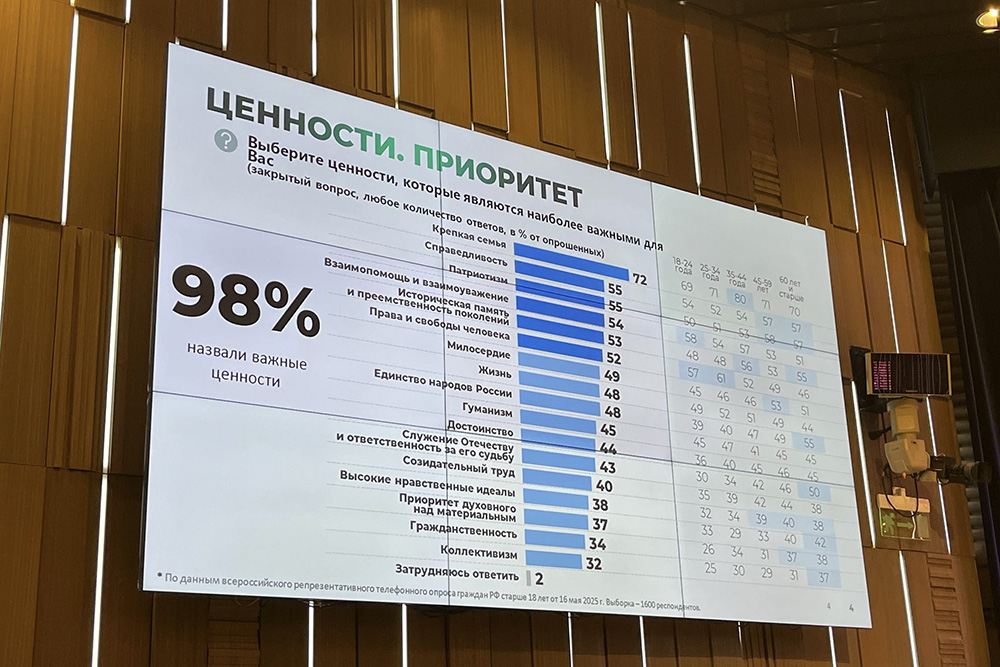 Участники обсудили ключевые вопросы, касающиеся укрепления национального единения, общероссийской гражданской идентичности и российской самобытности за счёт традиционной системы ценностей, сохранения национальной исторической памяти, противодействия фальсификации истории, изучения значимости традиций и их влияние на российское историческое наследие, включая вклад великих деятелей нашей страны. Важными в этом вопросе является реализация стратегии государственной информационной политики, способствующей укреплению позиций традиционных ценностей и предотвращающей распространение деструктивной идеологии, а также воспитательная работа в школах и вузах, ориентированная на уважение традиций, как ключевой инструмент государственной политики в области образования и культуры, необходимый для формирования гармонично развитой личности.