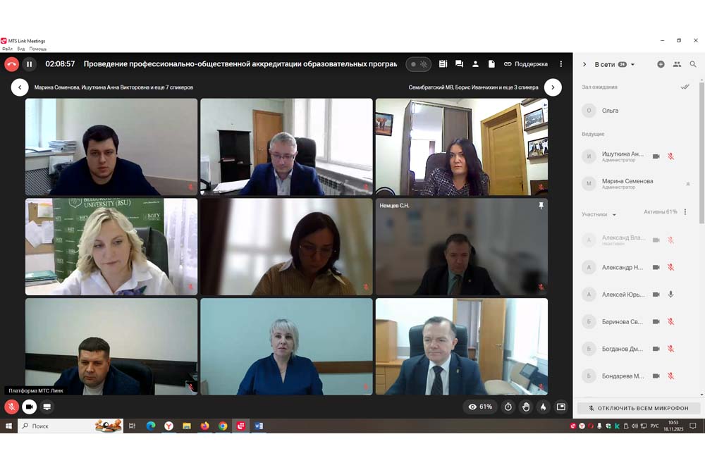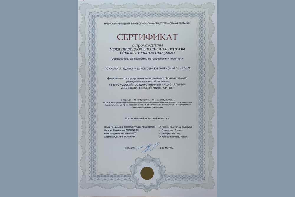 Общую встречу с руководством университета открыла начальник отдела международной деятельности автономной некоммерческой организации «Национальный центр профессионально-общественной аккредитации» Анна Ишуткина. Она представила экспертную комиссию, включающую представителей профессионального и студенческого сообществ. В состав комиссии под председательством зарубежного эксперта кандидата психологических наук, доцента, декана факультета психологии Гродненского государственного университета имени Янки Купалы Ольги Митрофановой, вошли заместитель председателя комиссии, кандидат психологических наук, доцент, заведующая кафедрой коррекционной психологии и педагогики Психолого-педагогического факультета ФГАОУ ВО «Северо-Кавказский федеральный университет», член Учебно-методического совета по Специальному (дефектологическому) образованию (МПГУ, г. Москва) Наталья Борозинец, директор областного государственного бюджетного учреждения для детей нуждающихся в психолого-педагогической и медико-социальной помощи «Белгородский региональный центр психолого-медико-социального сопровождения» — представитель профессионального сообщества Илья Манышев и представитель студенческого сообщества студентка 2 курса магистратуры по направлению 44.04.04 Профессиональное обучение (по отраслям) ФГБОУ ВО «Нижегородский государственный педагогический университет имени Козьмы Минина» Светлана Баринова. В условиях текущей ситуации в регионе экспертиза проходила в онлайн-режиме.