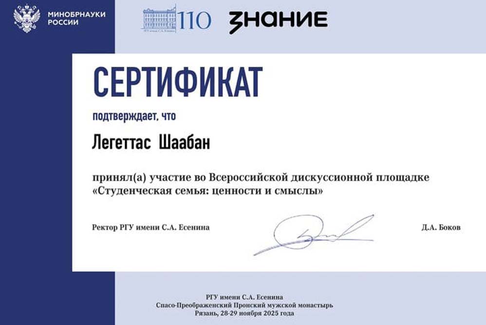 Студент института межкультурной коммуникации и международных отношений Легеттас Шаабан принял онлайн-участие в работе Всероссийской дискуссионной площадки для российских и иностранных студентов «Студенческая семья: ценности и смыслы», которая прошла в Рязанском государственном университете имени С.А. Есенина в комбинированном формате. Шаабан выступил с докладом на тему «Пересечение семейных ценностей Алжира и России», а также принял участие в работе образовательного, культурного и проектного треков, направленных на обсуждение формирования духовно-нравственных основ студенческой семьи и продвижение традиционных семейных ценностей в медиа-среде.