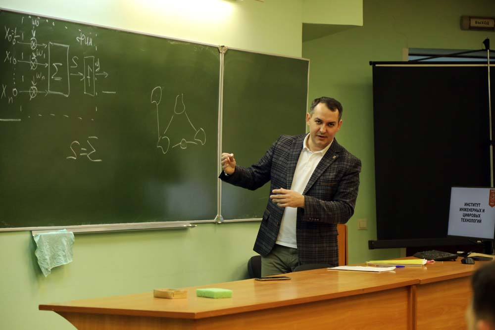 Завершилось мероприятие увлекательной лекцией о нейросетях «Сильный и слабый ИИ», с которой выступил директор института инженерных и цифровых технологий Александр Жихарев.