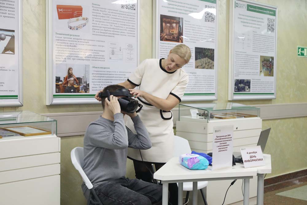 Программу для автоматизации психофизиологической коррекции психологического состояния с использованием технологий персонализированной виртуальной реальности презентовала доцент кафедры психиатрии, наркологии и клинической психологии Ульяна Москвитина, продемонстрировав работу изобретения.