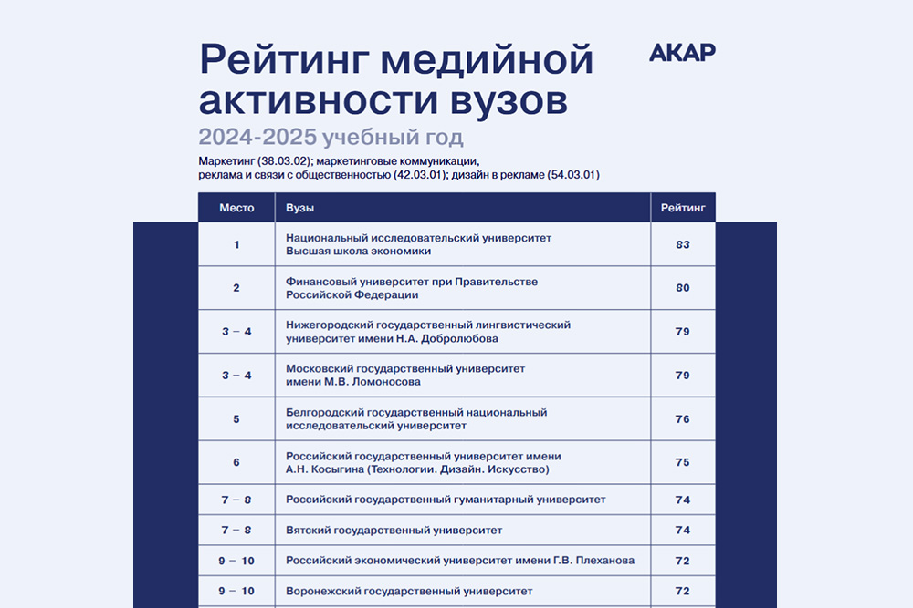 Рейтинг оценивает информационную активность университетов в отношении образовательных программ «Маркетинг» (38.03.02); «Маркетинговые коммуникации, реклама и связи с общественностью» (42.03.01) и «Дизайн в рекламе» (54.03.01) в течение учебного года.