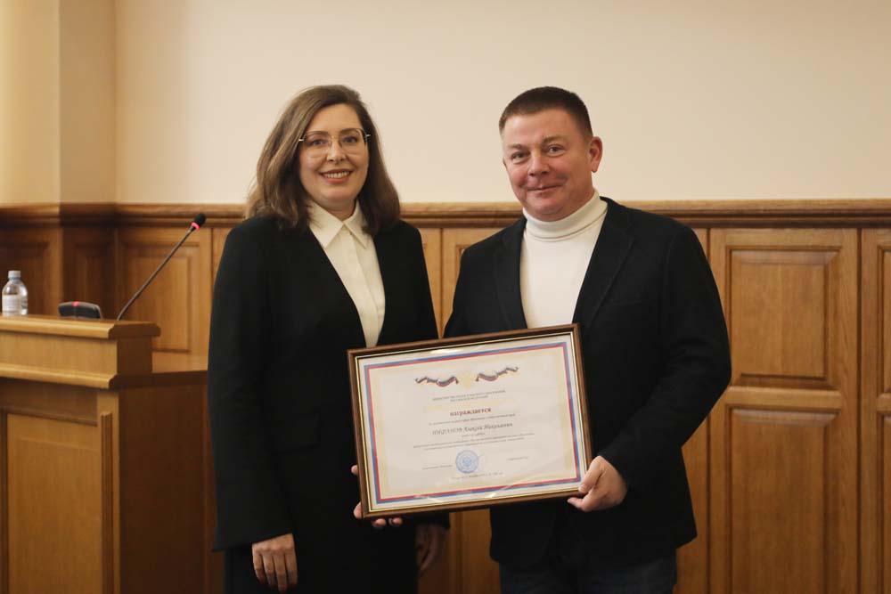 Ректор НИУ «БелГУ» Евгения Карловская вручила работникам университета награды Министерства науки и высшего образования Российской Федерации. За значительные заслуги и добросовестный труд в сфере образования звания «Почётный работник сферы образования Российской Федерации» удостоены профессор кафедры всеобщей истории историко-филологического факультета педагогического института Николай Болгов, заведующая кафедрой общей химии института фармации, химии и биологии, профессор Ольга Лебедева и профессор кафедры конституционного и международного права юридического института Елена Сафронова. Нагрудные знаки «Почётный наставник» Евгения Анатольевна вручила заведующей кафедрой информационных и робототехнических систем института инженерных и цифровых технологий Ольге Иващук и заведующей кафедрой романо-германской филологии и межкультурной коммуникации Института межкультурной коммуникации и международных отношений Оксане Кузьминой. Почётную грамоту Минобрнауки ректор вручила профессору кафедры конституционного и международного права юридического института Алексею Нифанову, а Благодарности министерства образования Белгородской области профессору кафедры фармакологии и клинической фармакологии медицинского института Михаилу Корокину и специалисту департамента молодёжной политики и воспитательной деятельности Олесе Хоревой. Почётной грамоты БРО Общероссийского профсоюза образования удостоена начальник отдела охраны труда и экологии управления комплексной безопасности Ольга Веселова.
