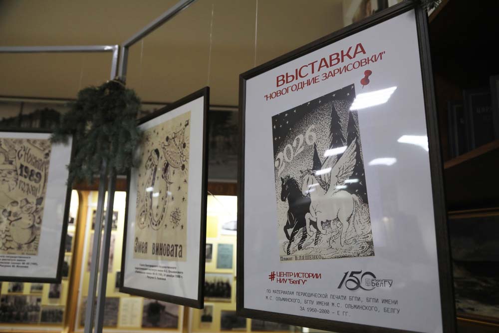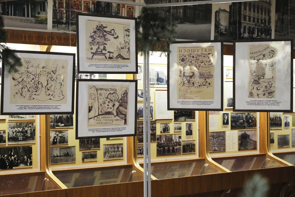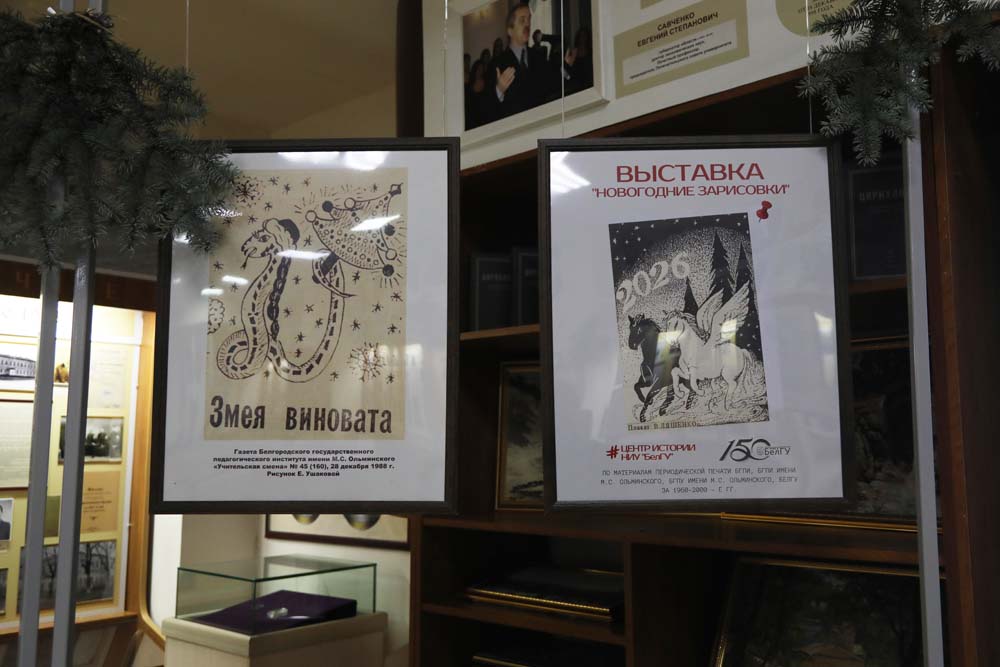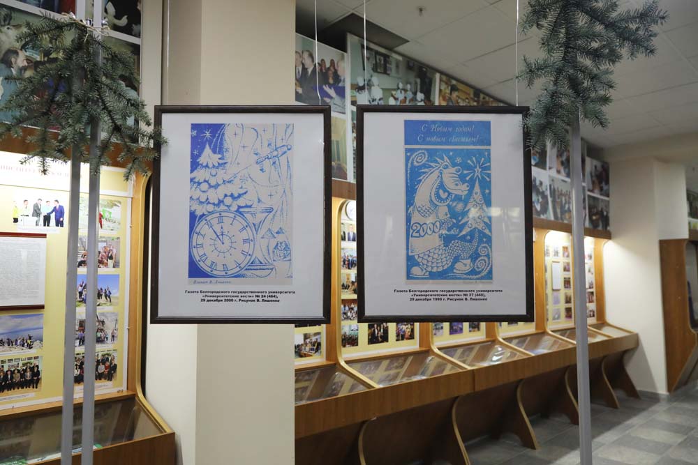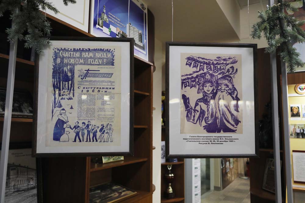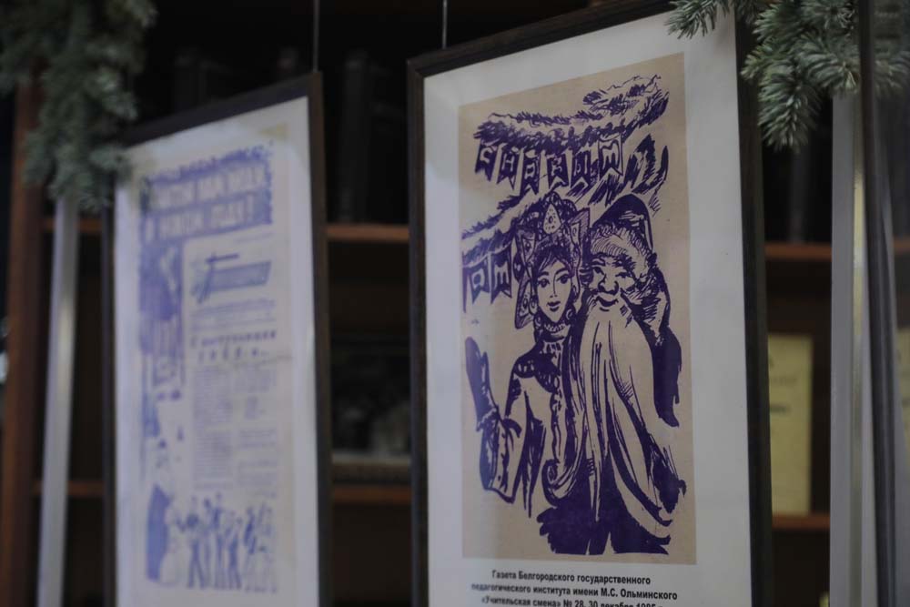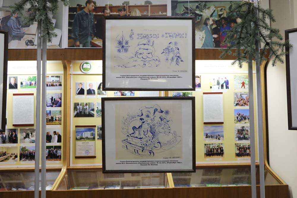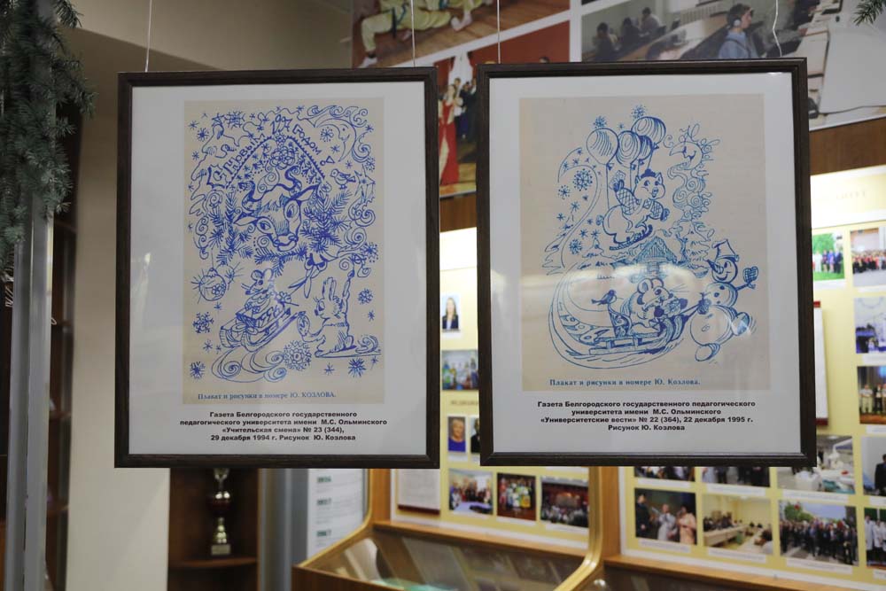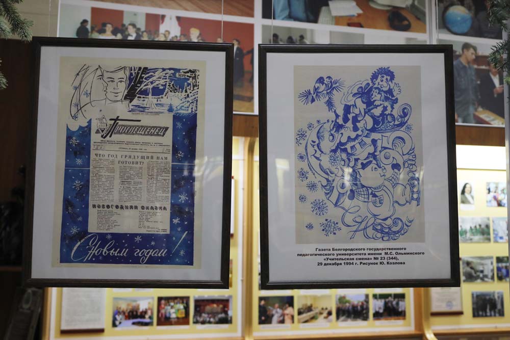 На выставке в Центре истории НИУ «БелГУ» представлены рисованные праздничные иллюстрации к новогодним выпускам периодических печатных изданий вуза разных лет.