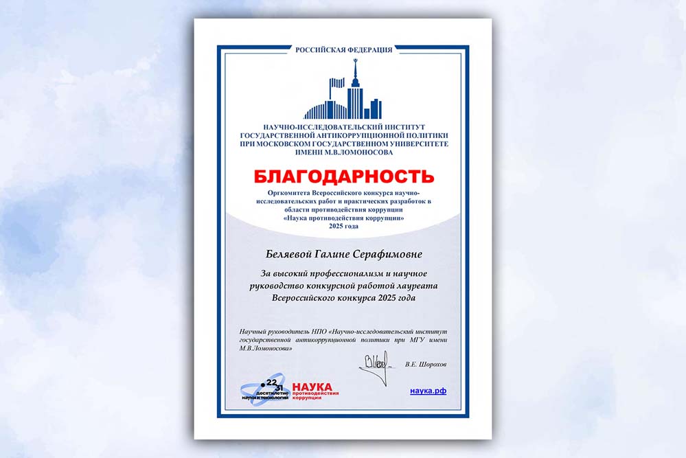 Научные работы молодых исследователей юридического института высоко оценены на Всероссийском конкурсе научно-исследовательских работ и практических разработок в области противодействия коррупции.