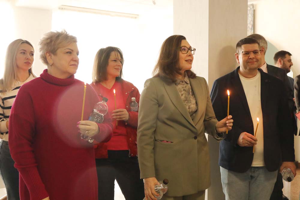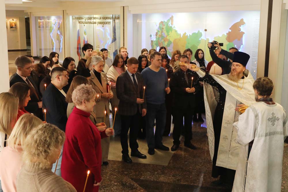 В холле главного корпуса вуза, где собрались сотрудники, руководители подразделений, представители ректората во главе с ректором Евгенией Карловской и студенты, настоятель домового храма НИУ «БелГУ» провёл молебен, поздравив собравшихся с праздником, и окропил присутствующих святой крещенской водой.