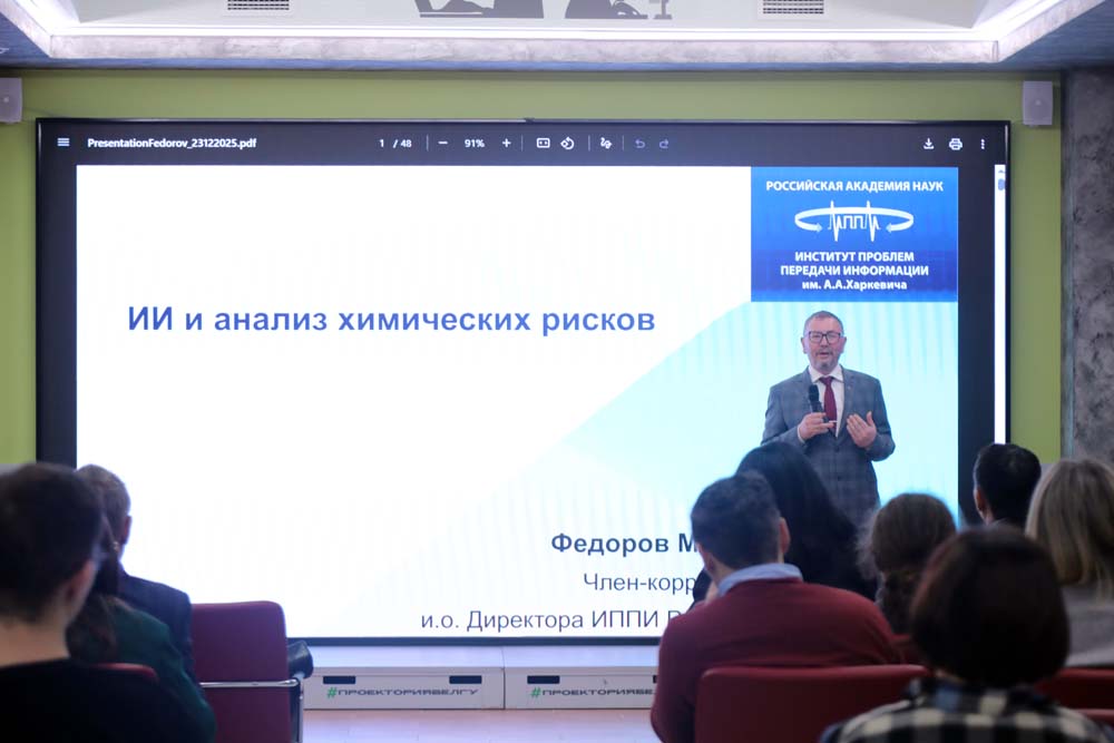 В Проектории НИУ «БелГУ» Максим Валериевич провёл семинар на тему «ИИ и анализ химических рисков». В обсуждении приняли участие ведущие учёные и молодые исследователи института информационных и цифровых технологий, института фармации, химии и биологии и НИИ фармакологии живых систем Белгородского госуниверситета.