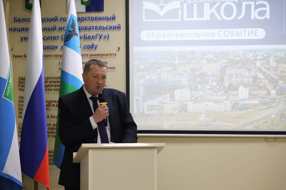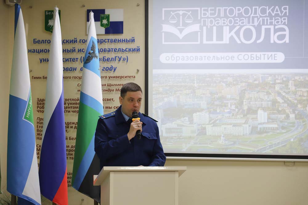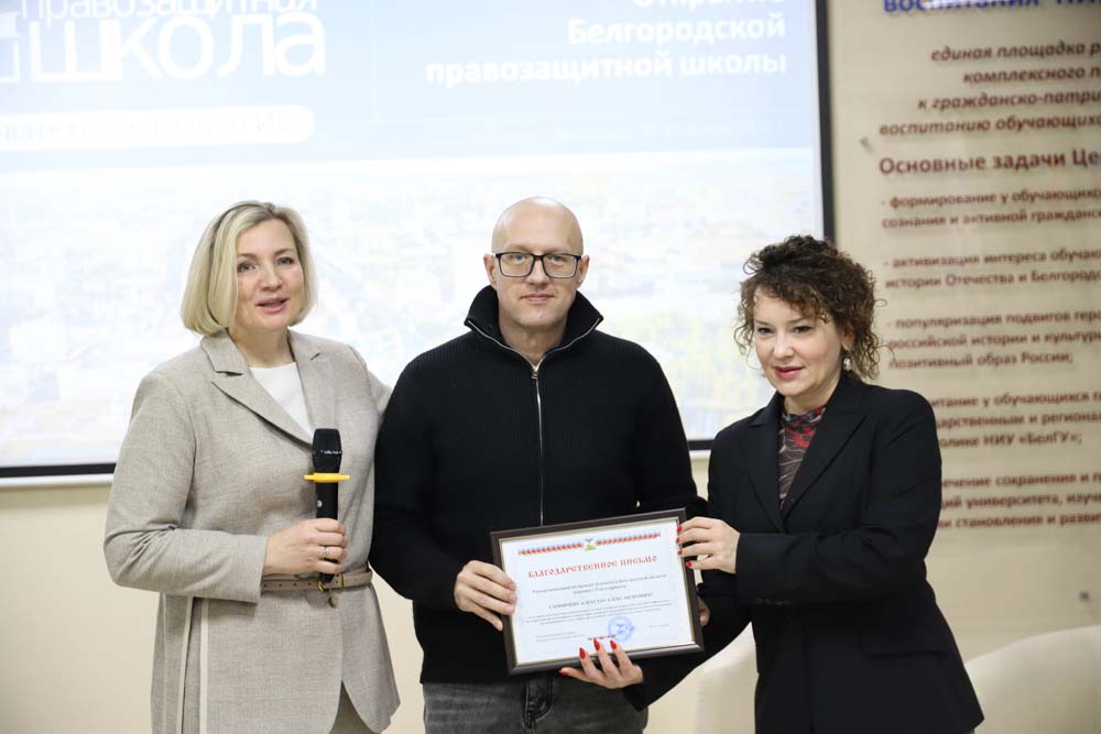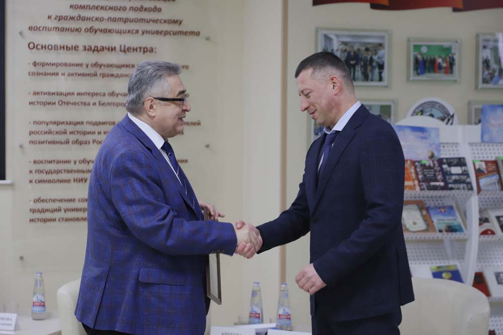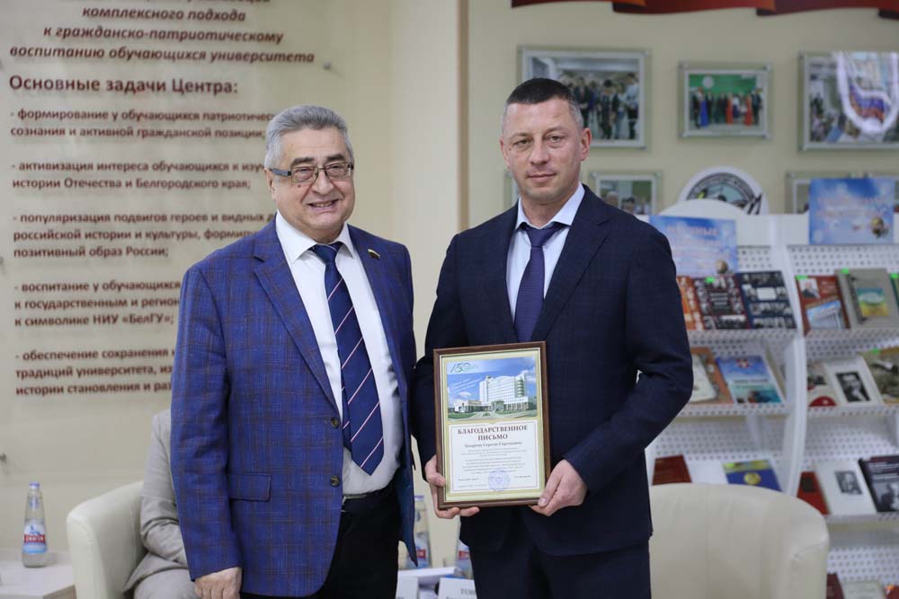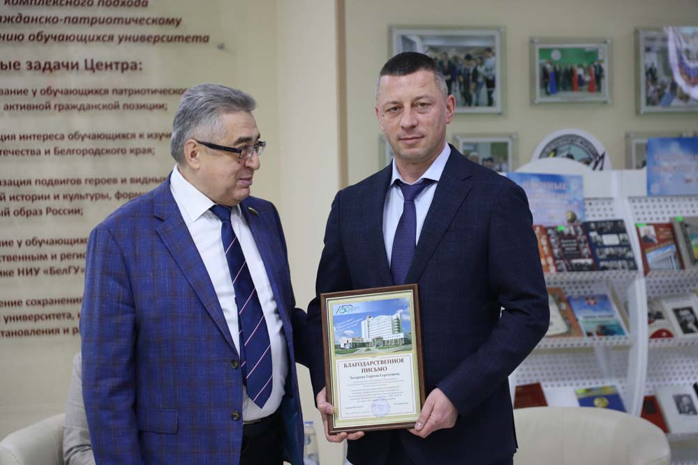 Со словами напутствия и пожеланием плодотворной работы к собравшимся обратился начальник Управления Судебного департамента в Белгородской области, выпускник юридического института НИУ «БелГУ» Сергей Захаров. От имени ректора Евгении Карловской Благодарственное письмо Сергею Сергеевичу вручил директор юридического института Евгений Тонков.