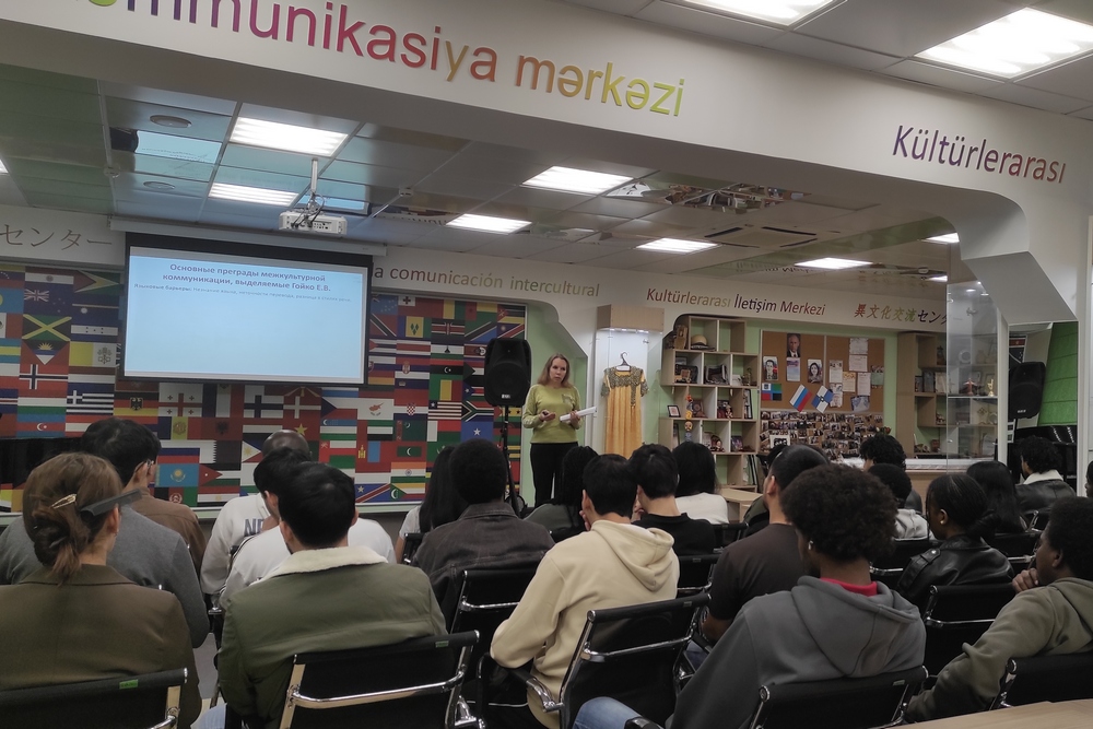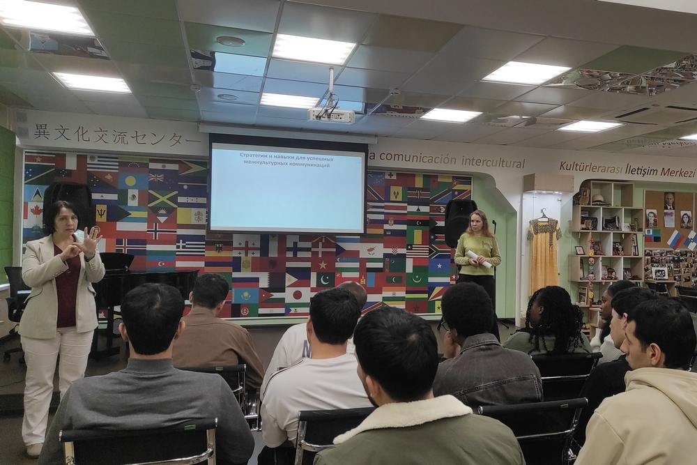 Евгения Толбатова обсудила с иностранными студентами барьеры в общении между представителями различных культур и конфессий, влияние стереотипов, языковых, невербальных и ценностных особенностей людей на установление и развитие взаимоотношений между ними.