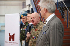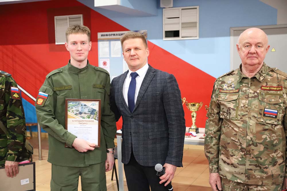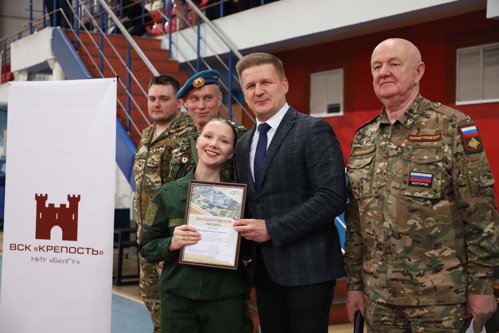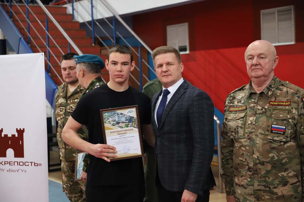 С приветственными словами к собравшимся обратился проректор по образовательной деятельности НИУ «БелГУ» Алексей Черницов. Он поздравил всех с предстоящим Днём защитника Отечества – праздником, который передаёт из поколения в поколение эстафету любви и преданности Отчизне. Алексей Евгеньевич вручил благодарственные письма за проводимую работу в области военно-патриотического воспитания и подготовку студентов к защите Отечества, а отличившимся студентам – благодарственные письма за большой вклад, активное участие и достигнутые успехи в деятельности военно-спортивного клуба крепость НИУ «БелГУ».