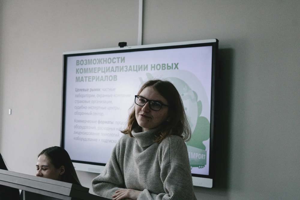 Разговор о химии начали с криминалистики. На встрече «Современные материалы в криминалистике и судебной экспертизе: виды и свойства» ассистент кафедры судебной экспертизы и криминалистики Кристина Гриневич предложила участникам посмотреть на материал как на «немого свидетеля». Речь шла о наноматериалах, фотолюминесцентных веществах и о том, как искусственный интеллект помогает анализировать сложные спектры.
