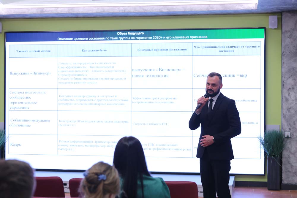 Вторая группа работала в траектории «Выпускник-визионер и новая образовательная модель университета», над вопросами: кто такой выпускник-визионер, какие качества, компетенции, способы мышления и типы опыта должны стать результатом образования, какие дефициты есть в текущей образовательной модели, а также какие элементы подготовки требуют пересборки.