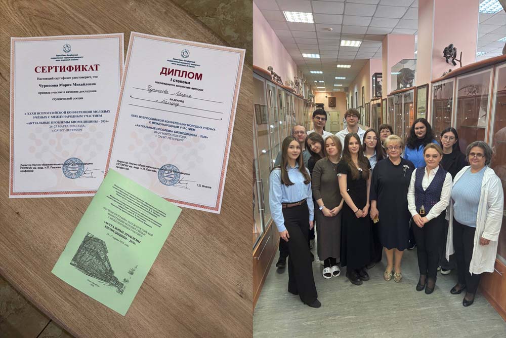 В Санкт-Петербурге на площадке ПСПбГМУ им. И.П. Павлова состоялась Всероссийская конференция с международным участием «Актуальные проблемы биомедицины-2026». В секции «Биология и генетика» с научным докладом выступила студентка 4 курса специальности «Лечебное дело» Мария Чурносова. Девушка рассказала о некоторых клинико-анамнестических и генетических характеристиках беременных с преэклампсией.