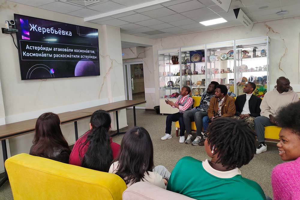 Эстафету космических мероприятий подхватила интерактивная дидактическая игра «Космос ближе, чем кажется: познавай, исследуй, побеждай!», организованная международным информационным центром совместно с институтом межкультурной коммуникации и международных отношений. Студенты из Китая, Туркменистана, Узбекистана, Чада, Нигерии, Намибии, Буркина-Фасо, Перу, Эквадора отвечали на вопросы об основных этапах освоения космоса человеком с 1957 по 2025 год. Разбившись на команды «Луна» и «Космонавты», иностранные студенты выполняли задания, связанные с грамматикой, лексикой, фонетикой русского языка, получали ключи для ответа на вопросы о важнейших событиях в истории космонавтики. В результате напряжённой борьбы победу одержала команда «Космонавты» с перевесом в один правильный ответ.