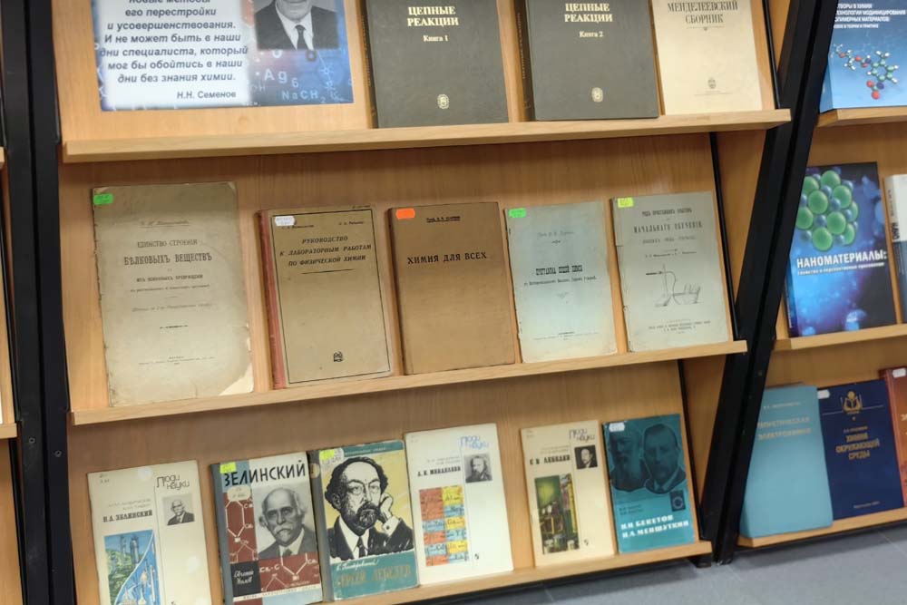 Слушателей также познакомили с печатными научными, научно-популярными и учебными изданиями по химии, в том числе редкими, из фонда университетской библиотеки. На книжной выставке и в обзоре-презентации «Химическая наука – хроника научного поиска» студенты смогли увидеть редкие издания из фонда университетской библиотеки и проследить историю развития химической мысли.
