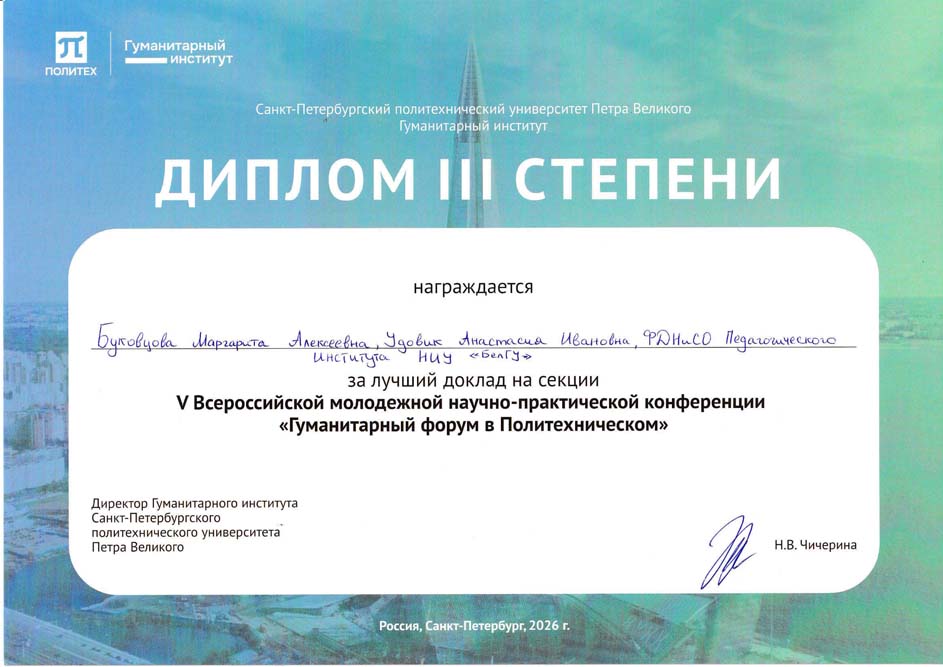 В своем исследовании Маргарита Буковцова и Анастасия Удовик (руководитель – Наталья Ильенко) доказали, что участие студентов в социально значимых проектах, работе Российских студенческих отрядов (РСО) и творческих объединениях напрямую влияет на формирование трёх ключевых компонентов профессионально-педагогической культуры: аксиологического, технологического и личностно-творческого.