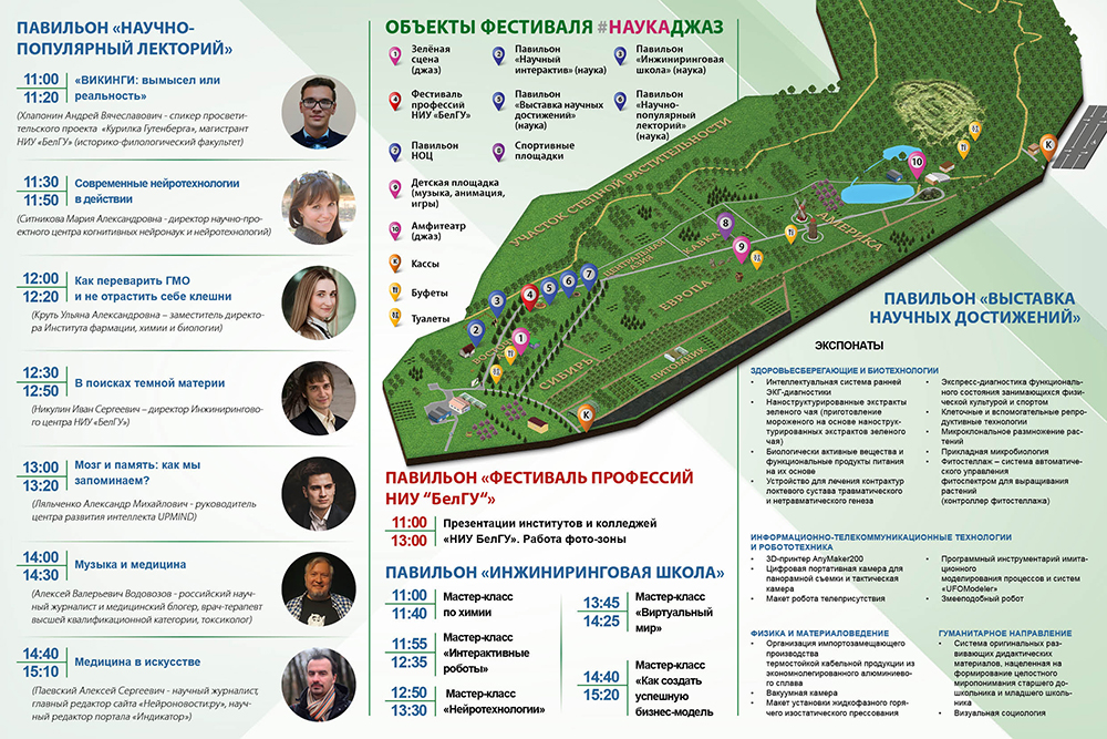 В программе фестиваля – научные площадки, интерактивная выставка «Прикоснись к науке», научные шоу, мастер-классы, спортивно-игровая программа. Учёные Белгородского госуниверситета и приглашённые из Москвы известные научные журналисты расскажут о связи науки и музыки, медицины и искусства, об искусственном интеллекте, тёмной материи и генно-модифицированных продуктах. Молодые учёные и студенты университета сразятся в интеллектуальной битве «Science Battle», покажут химическое шоу и устроят битву роботов.