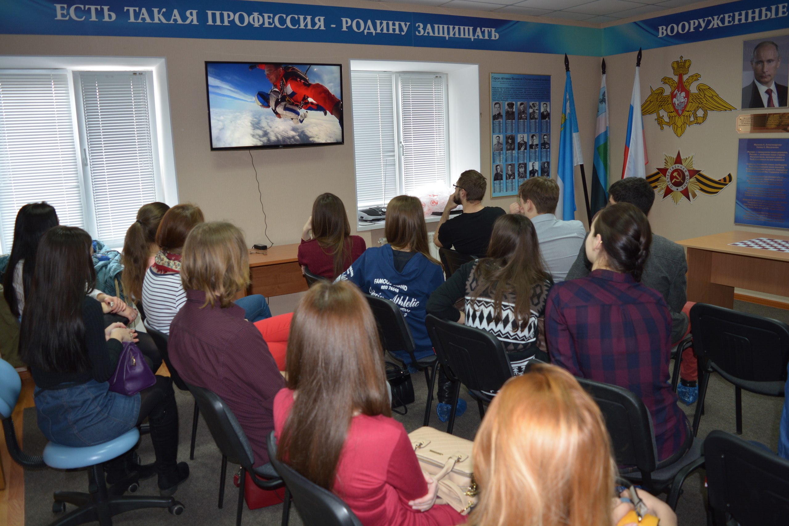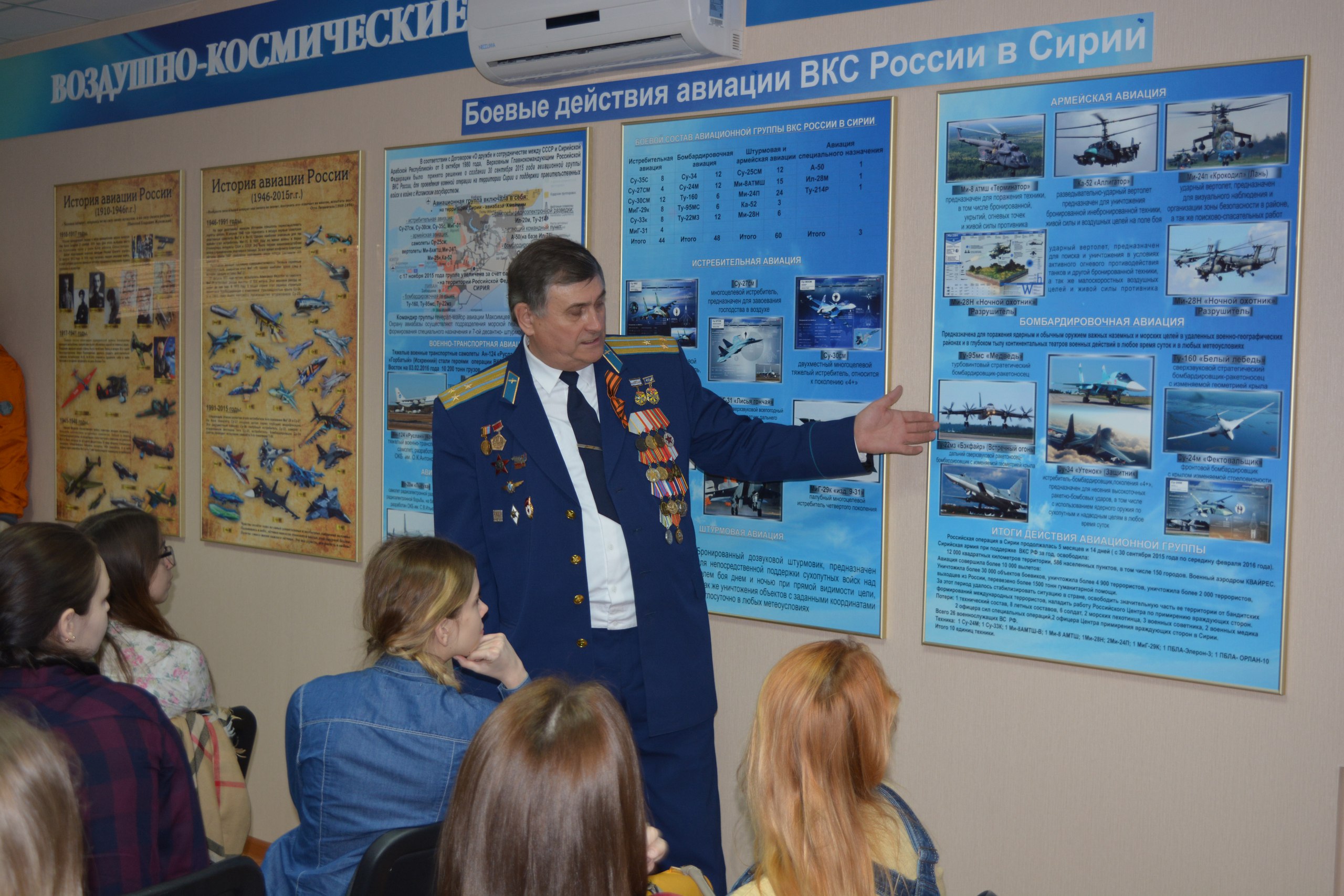 Активистов кратко ввели в исторический курс об изменениях авиационных технологий, а так же увлекли познавательными историями из жизни опытных военных лётчиков. Во время встречи ребята просмотрели интересные видеоматериалы и смогли лично получить ответы на все интересующие вопросы. В завершении мероприятия студентам были представлены настоящие костюмы лётчиков, способные поддерживать жизнестойкость пилотов на протяжении длительного времени.