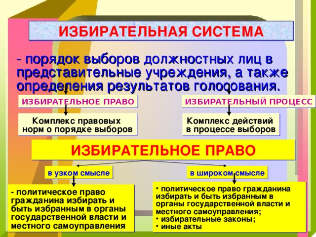 Студенты узнали о том, что избирательная система - это совокупность правовых норм, регулирующих порядок предоставления избирательных прав, проведения выборов в органы государства и местного самоуправления, определения результатов голосования. Она определяет порядок определения результатов голосования. Основными типами избирательных систем являются: мажоритарная и пропорциональная. Мажоритарная избирательная система характеризуется тем, что избранным в тот или иной выборный орган считается кандидат (или список кандидатов), набравший предусмотренное законом большинство голосов. Пропорциональная система предполагает распределение мандатов пропорционально голосам, полученным партиями или партийными блоками.