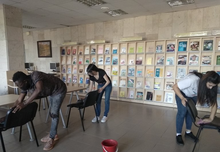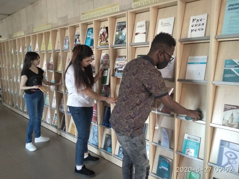 Волонтеры протирали от пыли информационные стенды, мыли входные двери, стены, окна и стеллажи в библиотеке. Ребята трудились несколько последних дней уходящего лета. Совместная работа позволила им познакомиться с инфраструктурой вуза, преподавателями и своими одногруппниками.