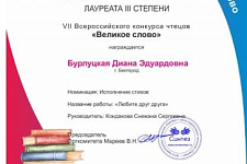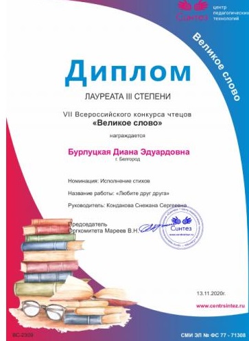 Участники «Школы ведущих» НИУ «БелГУ» стали победителями всероссийского конкурса чтецов «Великое слово». В их числе и студентка факультета психологии Бурлуцкая Диана.
