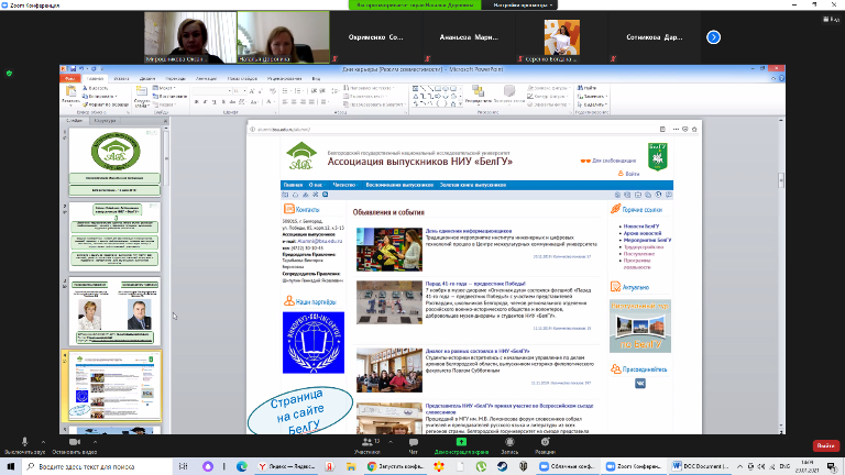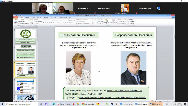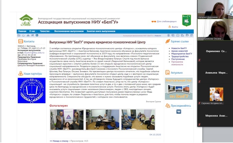29 января 2021 года состоялось онлайн встреча со студентами выпускных курсов факультета психологии педагогического института. Заместители декана Наталья Доронина и Оксана Мирошникова представили программу лояльности и возможности вступления в Ассоциацию выпускников НИУ «БелГУ».