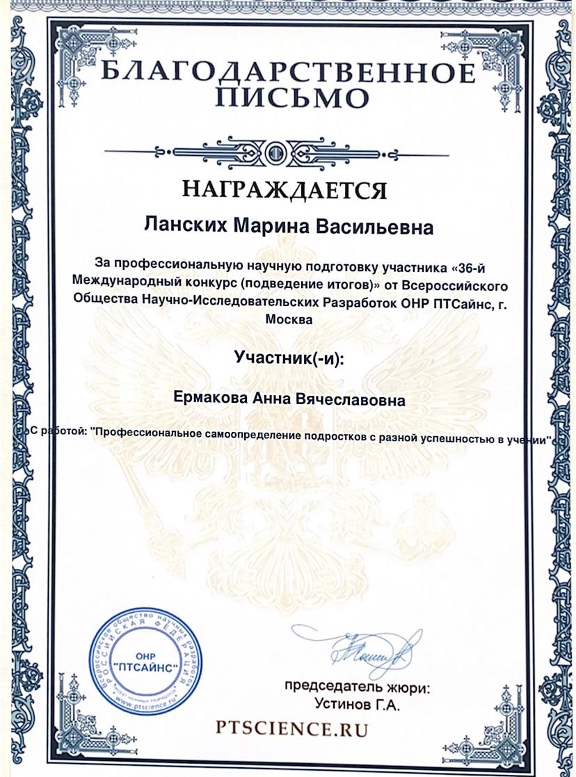 Научному руководителю студентки ‒ канд. пед. наук, доценту кафедры возрастной и социальной психологии Ланских Марине Васильевне вручили благодарственное письмо за профессиональную научную подготовку участника конкурса.