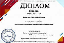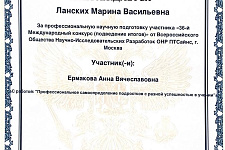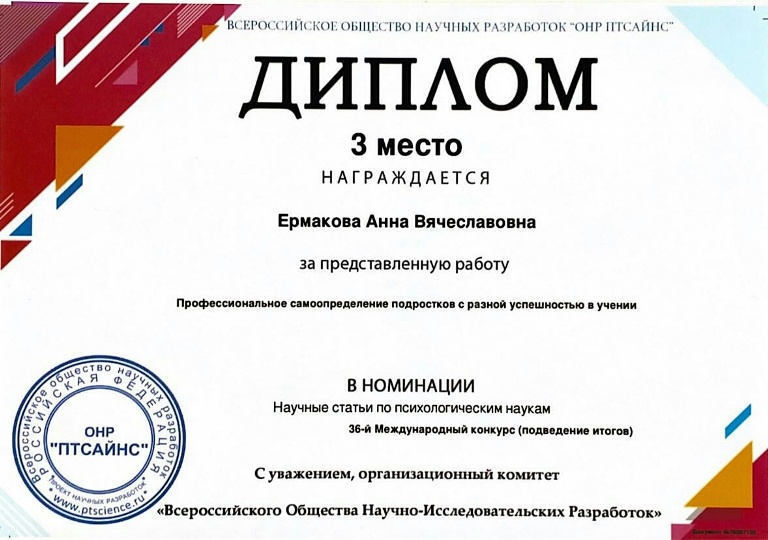 Студентка 4 курса, группы 02061703, Ермакова Анна заняла призовое место по итогам 36-го Международного конкурса, организованного Всероссийским Обществом Научно-Исследовательских Разработок ОНР ПТСайнс, г. Москва. Научная статья, с которой выступала Анна, была посвящена актуальному вопросу профессионального самоопределения подростков с разной успешностью в учении. Данная работа была высоко оценена жюри и по итогам конкурса студентка была награждена дипломом за 3 место в номинации «Научные статьи по психологическим наукам».