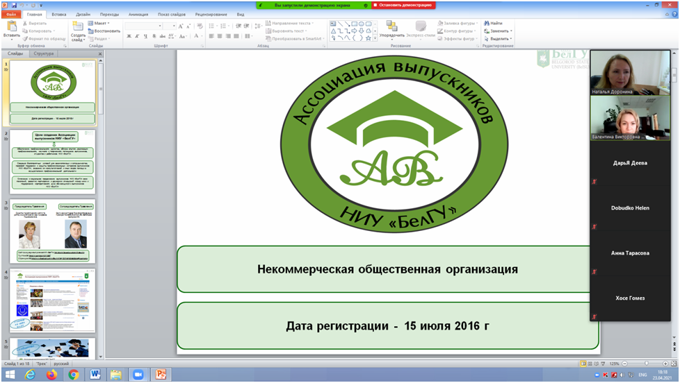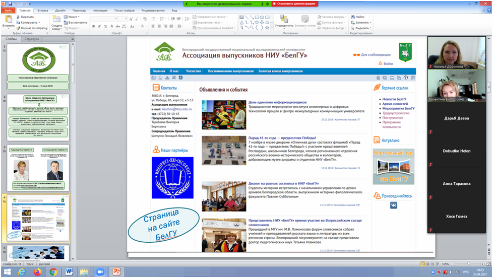 23 апреля 2021 г. заместителями декана факультета психологии педагогического института Натальей Дорониной и Оксаной Мирошниковой была организована онлайн встреча со студентами выпускных курсов заочной формы обучения. На собрании была представлена информация о корпоративной организации «Ассоциация выпускников НИУ «БелГУ», возможности вступления в нее, а также программа лояльности для выпускников университета.