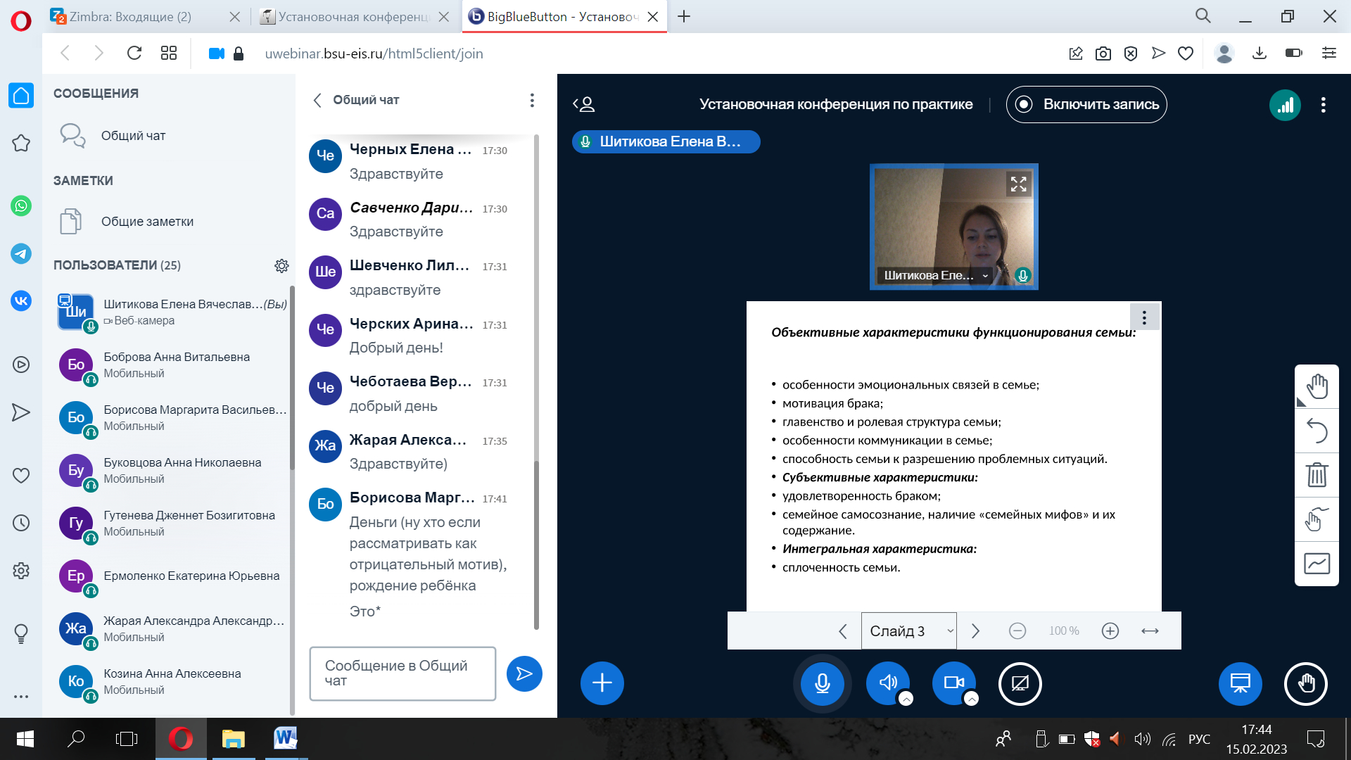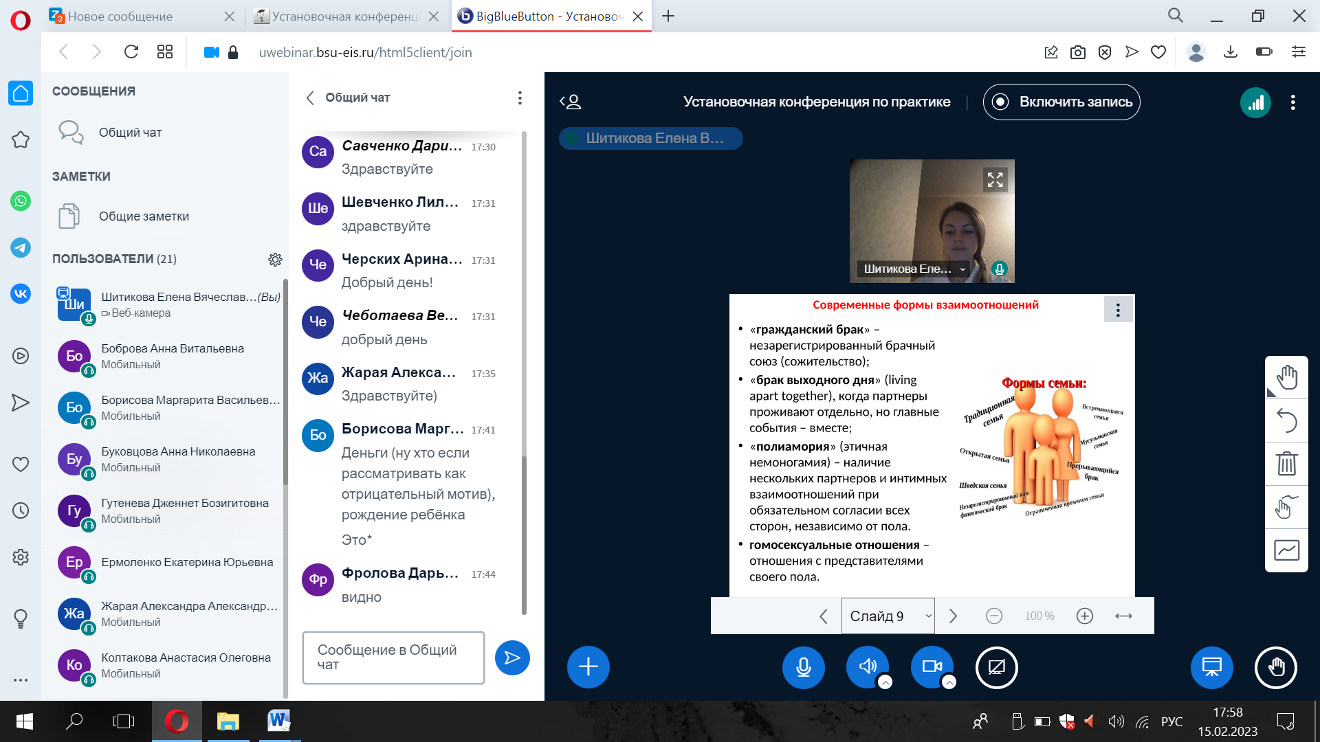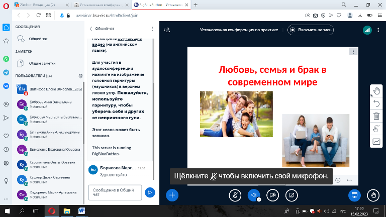 15.02.2023 г. на базе факультета психологии педагогического института НИУ «БелГУ» состоялось первая тематическая встреча семейного клуба «Счастливая семья». Одной из основных целей деятельности семейного клуба является развитие готовности молодых людей к семейной жизни. Целевая аудитория, прежде всего, молодые люди – девушки и юноши, которые осознанно подходят к проектированию своего жизненного пути, и построение крепкой семьи и благоприятных семейных отношений является для них одной из приоритетных задач.