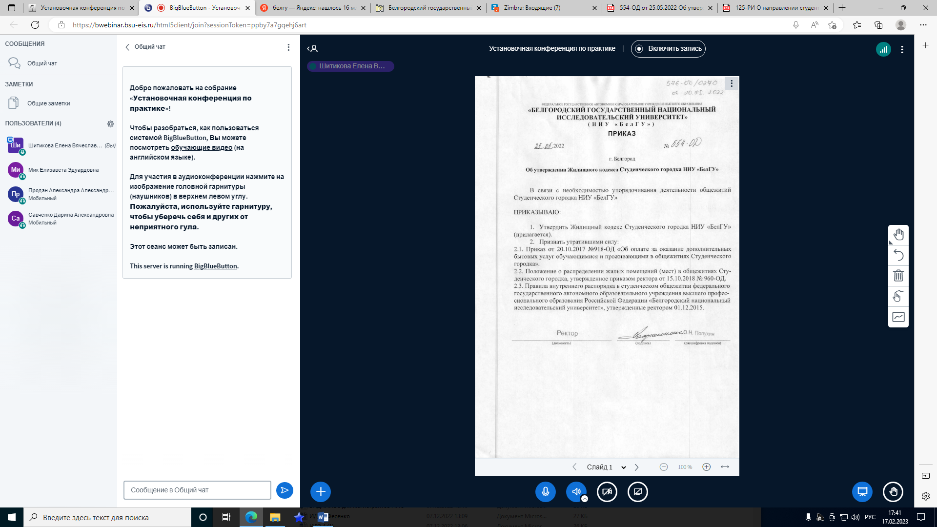 Студентам были в очередной раз представлены нормативно-правовые документы, регламентирующие деятельность студгородка. Участники мероприятий обсудили также правила внутреннего распорядка в студенческом общежитии, меры дисциплинарной ответственности за правонарушения. В заключение были затронули вопросы своевременной оплаты за проживание в общежитии.17.02.2023