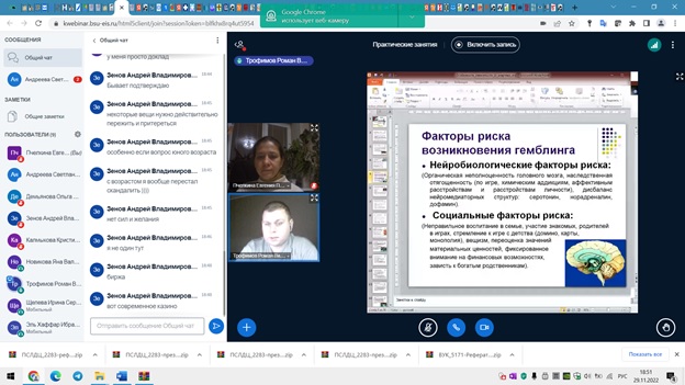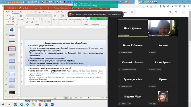 Была проанализирована динамика употребления наркотиков и алкоголя в регионе за последнее время и рассмотрены ее социальные и психологические последствия. Акцент делался на возможностях профилактики на социальном и личностном уровнях. Студенты обсудили возможные средства первичной, вторичной и третичной профилактики и сделали вывод о последовательном ее усложнении с усилением развития зависимости, а значит приоритете форм первичной профилактики. Предложили свои варианты.