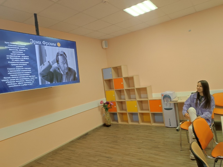 Ведущие Новакова Мария (гр. 02062201) и Бойкова Ангелина (гр. 02062201) рассказали об авторе книги, немецком психотерапевте, социальном психологе, философе – Эрихе Фромме, напомнили основные разделы книги, подготовили интересные вопросы.
