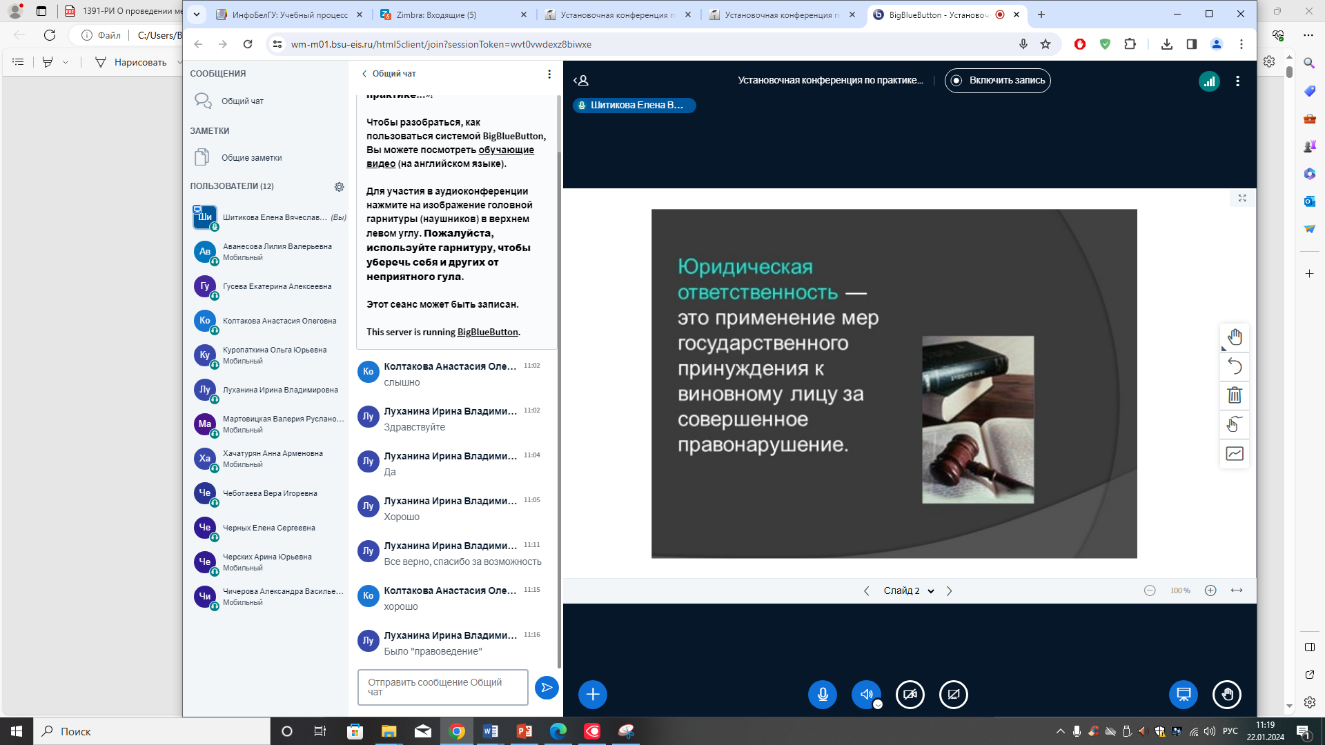 22.01.2024 куратором Е.В. Шитиковой проведено мероприятие со студентами второго курса факультета психологии (гр. 02062203 и гр. 02062203), посвящённое знакомству с видами юридической ответственности. Как известно, знание законов помогает защититься от несправедливого обвинения, а также повышает компетентность человека в понимании, как правильно поступить в той или иной ситуации. Каждый поступок имеет последствия, некоторые из них регулирует законодательство РФ.