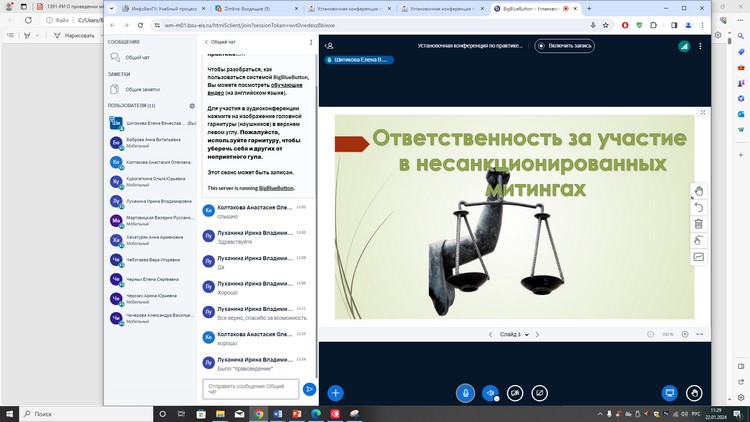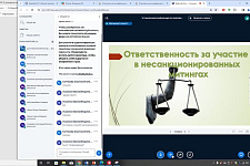 Отдельно остановились на вопросе об ответственности за участие в несанкционированных митингах, шествиях и иных акциях. Студенты ознакомились с информацией о том, что, согласно части 6.1 ст. 20.2 КоАП РФ, за совершение вышеуказанных действий применяется ответственность в виде административного штрафа (от 10 000 до 300 000 рублей), или привлечения к обязательным работам на срок до 100 часов, или административного ареста на срок до 15 суток.