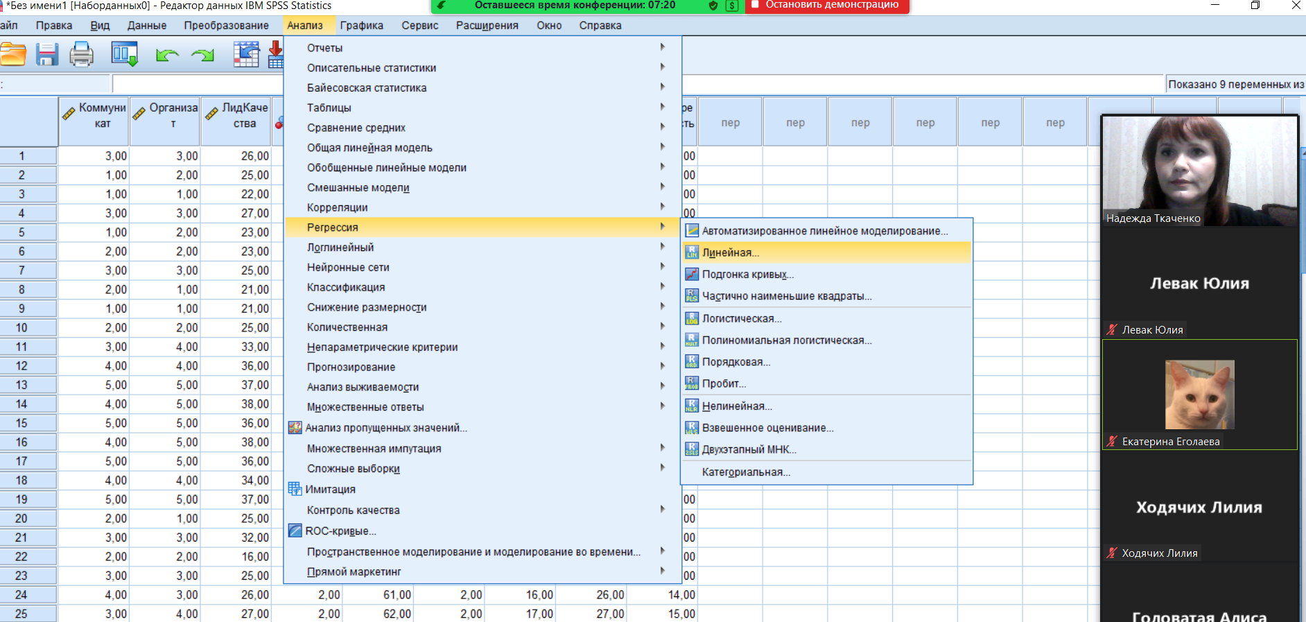 22 апреля доцент кафедры возрастной и социальной психологии Ткаченко Надежда Степановна провела мастер класс на тему: «Применение программы SPSS Statistics в научной психологии». Участникам мастер класса познакомились с возможностями программы SPSS Statistics по сравнению с другими имеющимися программами. На примерах реальных научных исследований были продемонстрированы особенности использования пакета статистических программ SPSS Statistics при подсчете разнообразных математических методов (критерия Крускала-Уоллиса, корреляционного и множественного регрессионного анализов). Студенты приобрели навык интерпретации данных при полученном статистическом выводе. В следующую встречу договорились обсудить специфику обработки данных в SPSS Statistics с использованием таким математических методов, как дисперсионный, дескриптивный и факторный анализы.