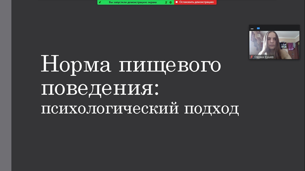 26 апреля ассистент кафедры общей и клинической психологии Кушко Оксана Юрьевна провела мастер класс на тему «Норма пищевого поведения: психологический подход». Актуальность данной темы связана с высокой распространенность нарушений пищевого поведения и расширением класса пищевых нарушений. Оксана Юрьевна подчеркнула существующую проблему выделения нормы пищевого поведения в психологии, освятила основные подходы к выделению этой нормы. Были представлены теоретические концепции, описывающие пищевое поведение, факторы, его детерминирующие. В процессе обсуждения со студентами, решения кейсов обнаружена необходимость формирования адекватного, адаптивного пищевого поведения у детей уже с ранних лет. «Для нормализации веса и пищевого поведения не ищите «правильную» еду, а ищите правильную жизнь. Но существует ли такое понятие как «правильная одежда», «правильная обувь»…? Это очень индивидуально. Поэтому очень важно опираться на индивидуальный опыт и индивидуальные особенности человека»